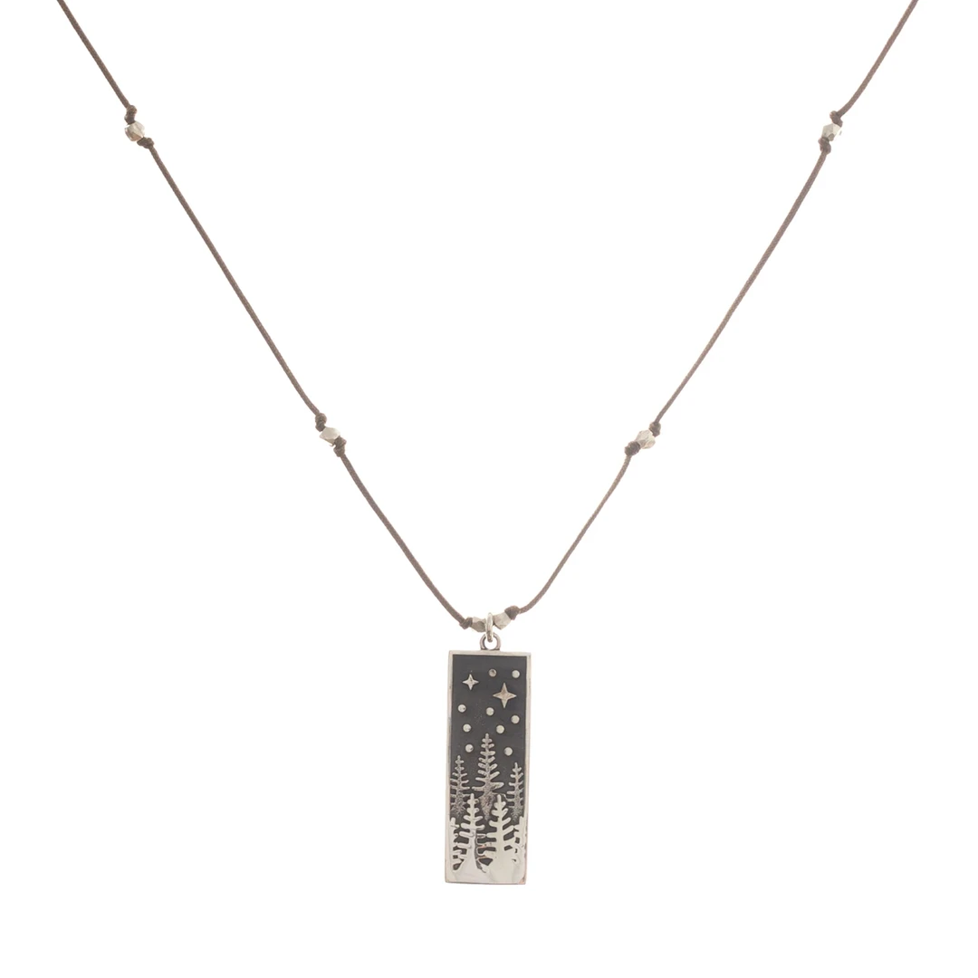 Celebrate the outdoors in style with the new Alpine Dream charm necklace. With a long thin rectangle shape, the dreamy design of queenly trees against a starry sky, this pretty little necklace is water friendly and super strong. Choose from an array of nylon cord colors to personalize your look and then get out there and have fun with it!