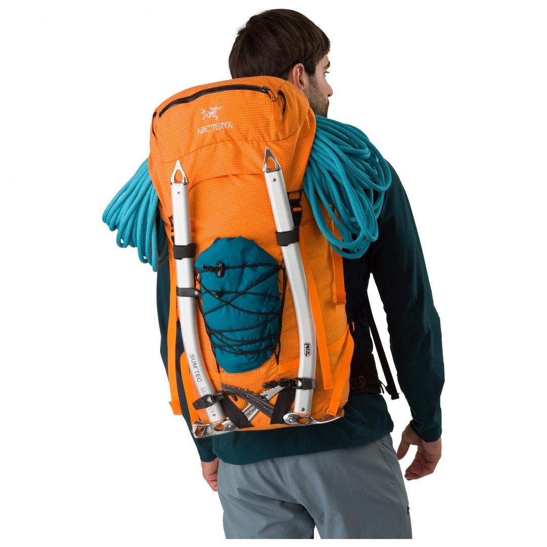 Arc’teryx developed its own fabric to achieve the hardwearing durability necessary for alpine and rock climbing. Prioritizing abrasion and tear resistance, a liquid crystal polymer ripstop grid is incorporated in a high tenacity nylon fabric. Extremely versatile, customizable options suits the needs of varied alpine adventures. A removable framesheet and an adjustable, removable top lid give the option to shed weight. Custom webbing daisy chains securely lash gear and ice pick capture accommodates a range of angles