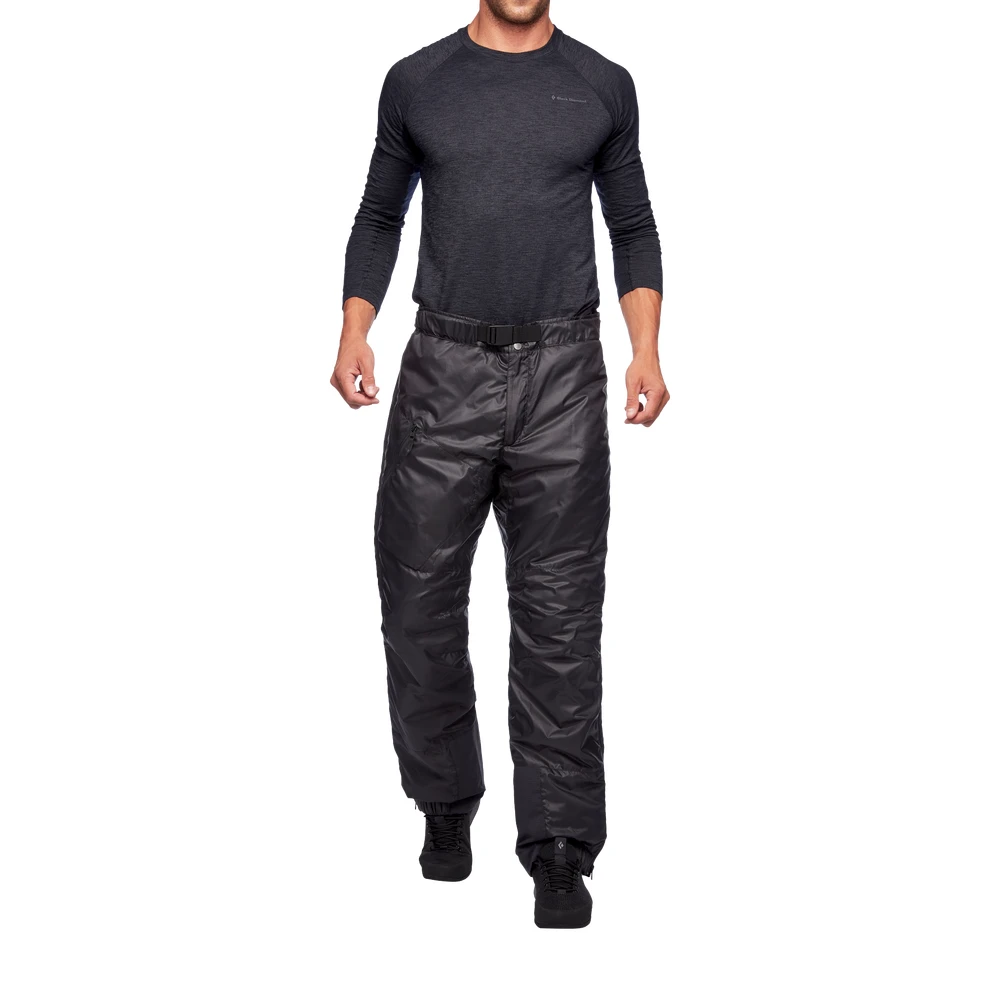 The matching lower half to BD’s Belay Parka, the Black Diamond Belay Pants are super-warm, insulated puffy pants for teeth-chattering, feet-stomping belay conditions. Designed to be worn over shell pants and filled with lofty ThermoLite® insulation, the Belay Pants insulate even when wet, compress in your pack, and feature full-length side zippers for easy on and off while wearing crampons. An integrated adjustable belt helps you dial in the fit over varying layers.