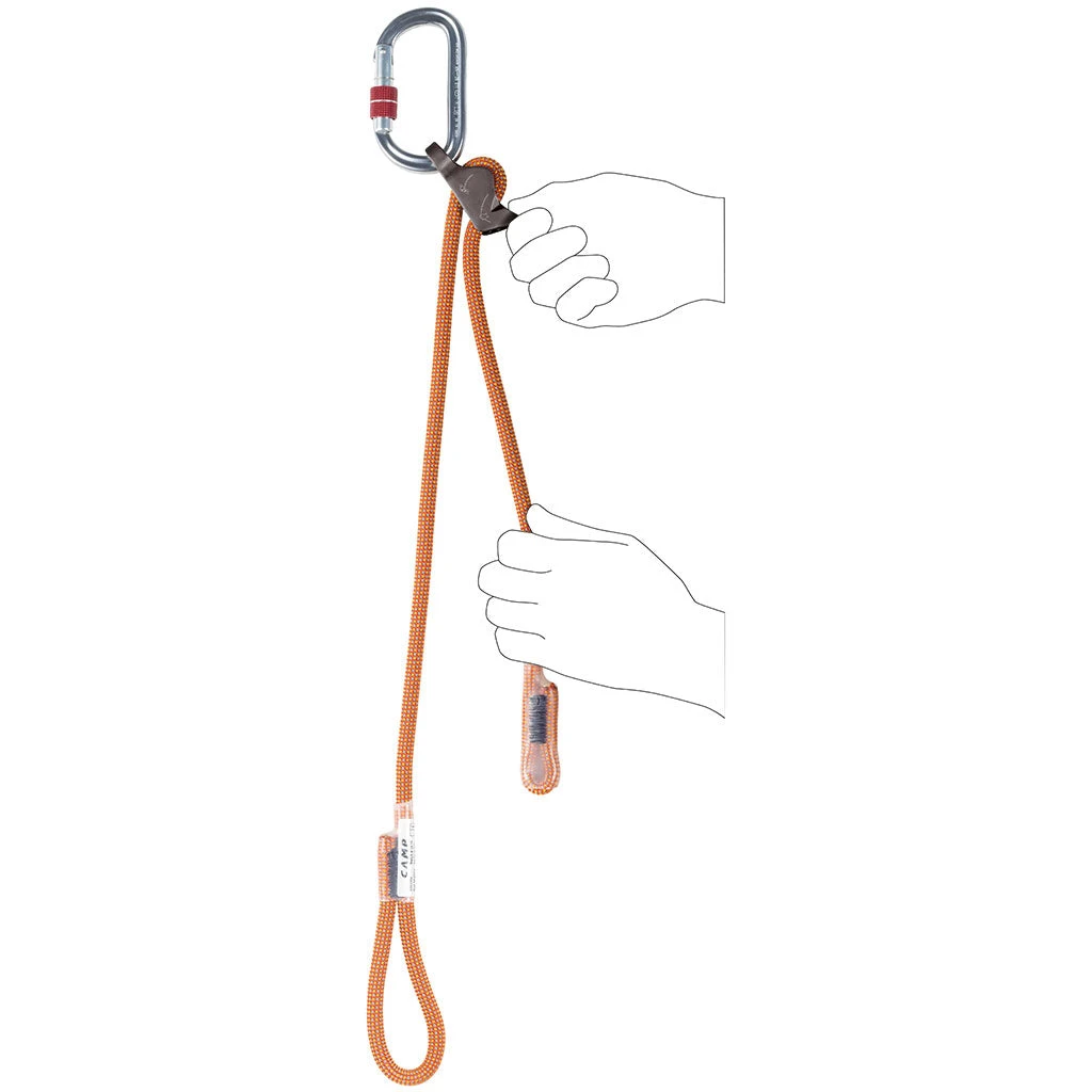 Adjustable lanyard for quick, easy and safe positioning at anchors. The lanyard remains girth hitched to the tie-in point of the harness and attaches to the anchor using a standard locking carabiner. Once connected, simply pull on the free end of the lanyard to tension into the anchor or hold the device open with the thumb lever to release tension. 9.7 mm dynamic rope. Adjustable from 20-100 cm.