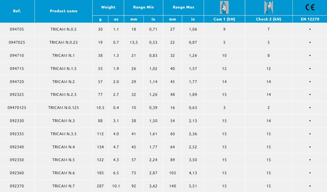 Look on the rack of most experienced trad climbers and you are almost certain to see an assortment of Tricams. Most climbers agree that visiting the Gunks without multiples of pink through purple is a serious mistake. These wondrous pieces of pro can be used either as cams or nuts and often work where nothing else fits. Tricams are ideal in horizontal cracks, pockets, and shallow vertical cracks. The larger sizes are an affordable way to augment a rack of cams and are ideal for belay anchors due to their high strength and light weight. Tricams can also be placed in icy cracks where regular cams do not work. Our engineers recently spent some time working on one of the age-old questions with the Tricam – how to stiffen the sling without impeding its ability to engage the camming action. After much experimenting, we rested on the simple solution of carrying the inner band of webbing further towards the head and using a new stitch pattern. The result is a naturally stiffer sling that makes one-handed placements easier, but still engages the cam in active mode and will even increase durability over sharp edges with the additional layer of material.