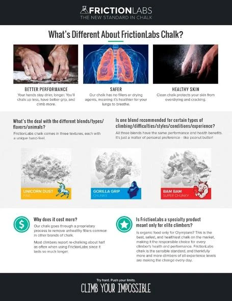 - Works as a stand-alone chalk replacement or as a base layer for use with FrictionLabs loose chalk blends (sold separately)