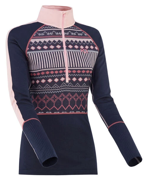The Kari Traa Perle Half-Zip is a mixed-blend women’s baselayer top with a bold jacquard-knit design on the chest. The quick-drying fabric wicks moisture away from your body when things heat up. The slim cut, ribbed forearm and solid-color raglan sleeves add to the look and make it great for wearing under other layers. This all-season favorite is also great for mix-and-matching with the Perle Pant styles. FIT: Slim silhouette, raglan sleeves, high collar