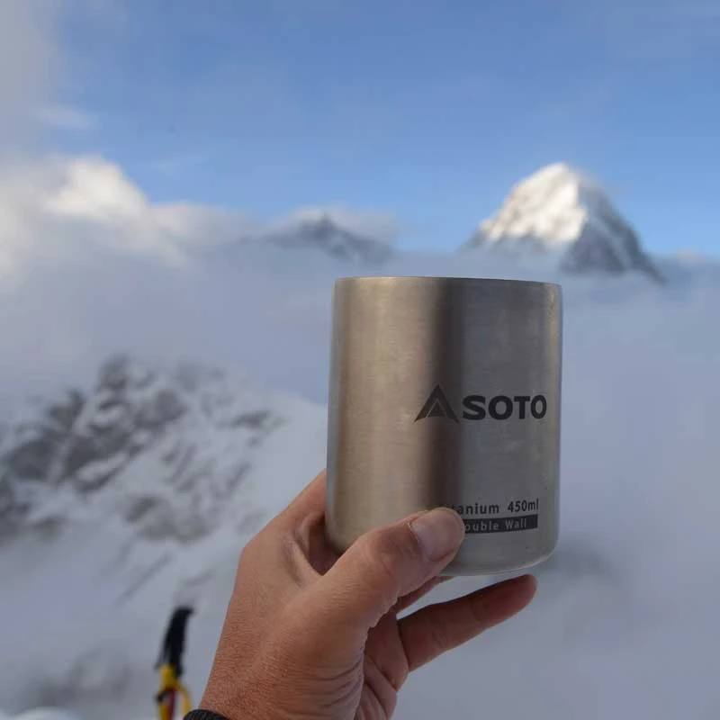 Titanium, Double-wall Mug. Ultra-light, corrosion-resistant titanium mug. Double-wall construction keeps cold drinks cold and hot drinks hot. High-quality, well-made mug with laser-etched logo; finished by skilled craftsman. Versatile mug suitable for soup or a light meal as well as coffee and other liquids. No metal smell or taste. 450 ml (15 fl. oz.) no handle