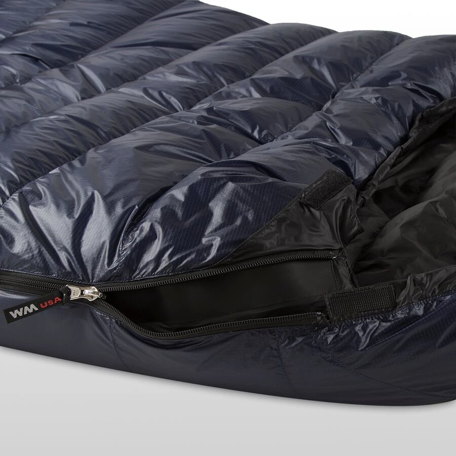 The latest addition to the Extremelite Series is a wide sleeping bag made for side sleeping comfort, the Terralite. It features 12 denier ripstop nylon shell fabric with a 15 denier nylon taffeta lining material. There are two zippers allowing this bag to mate with our mummy bags and the second zipper opens the bag up completely around the foot. With both zippers open this bag can make a fairly wide “camper van” comforter, but even when zipped up it is extremely comfortable. This is due to its wide girth through the middle of the bag, a design that side sleepers will find ideal. Despite the comfortable shape, this bag weighs less than two pounds.
