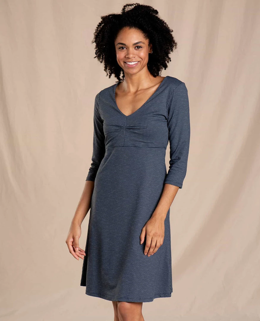 With clothes, there’s no such thing as unconditional love. We want great fit, form and function, or nothing at all. With that in mind, we propose the Rosalinda Dress. With a complementary shape, a stretchy Samba knit blend of Tencel®, organic cotton, and spandex, and work-to-play adaptability, there’s no limit on how happy you two will be together. Benefits include a V-neck, bust pleats, double-layer empire bodice, three-quarter sleeves, zipper hand pocket, and an A-line drape to the knee.